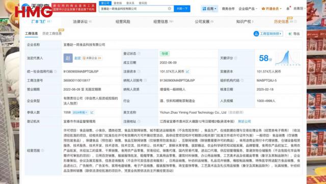 天眼查 App 显示,赵一鸣零食关联公司宜春赵一鸣食品科技有限公司成立于 2022 年 6 月,法定代表人为赵定,经营范围包括食品销售、小食杂、酒类经营、食品互联网销售等,由湖南鸣鸣很忙商业连锁有限公司全资持股。